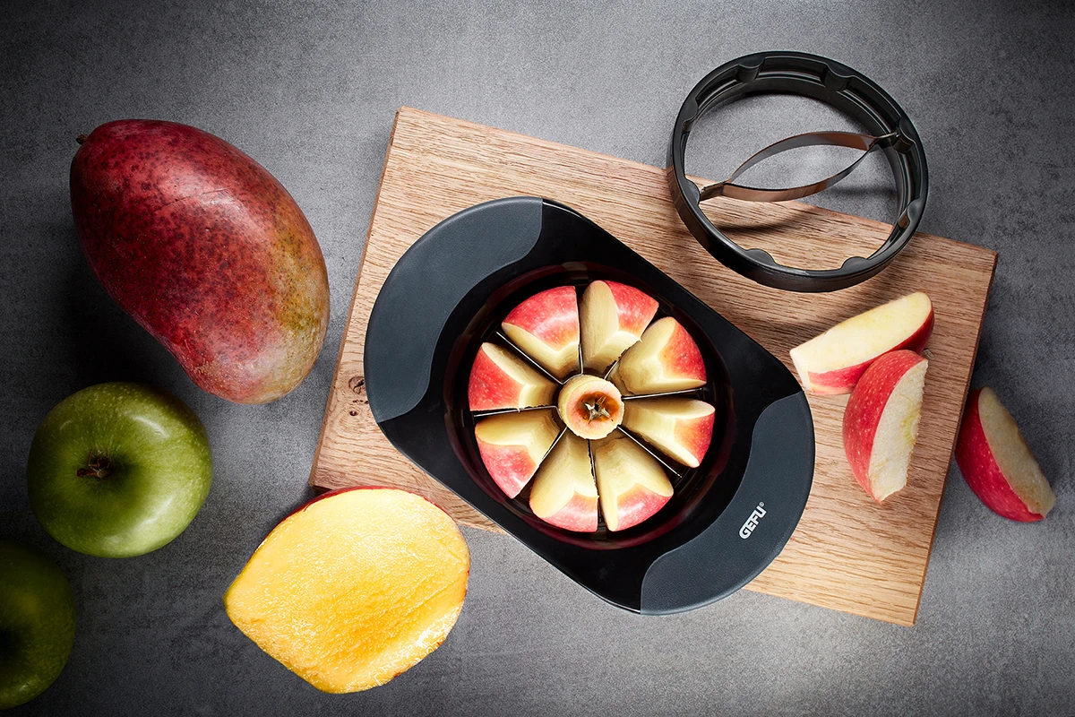 Heute schon geswitcht? Mit dem 2-in-1 Klingensystem lassen sich knackige Äpfel spielend in acht appetitliche Stücke und duftende Mangos in zwei saftige Hälften verwandeln.