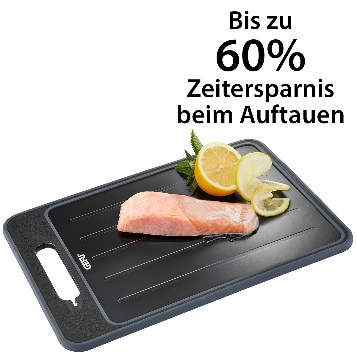 Schneller auftauen und sicher schneiden: das innovative CUT PRO kann beides. Seine elegante schwarze Aluminiumseite verkürzt die Auftauzeit gefrorener Lebensmittel bis zu 60 % ohne Geschmacks- und Qualitätsverlust. Die Schneideseite aus robustem Kunststoff ist extra rutschhemmend und garantiert sicheres Schneiden.