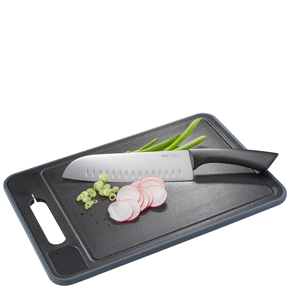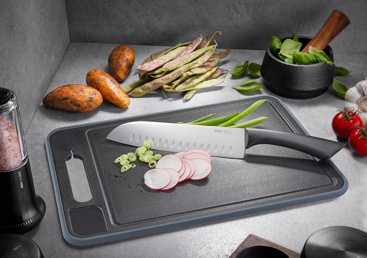 - Schneideseite mit umlaufende Saftrille zum Auffangen von Flüssigkeiten