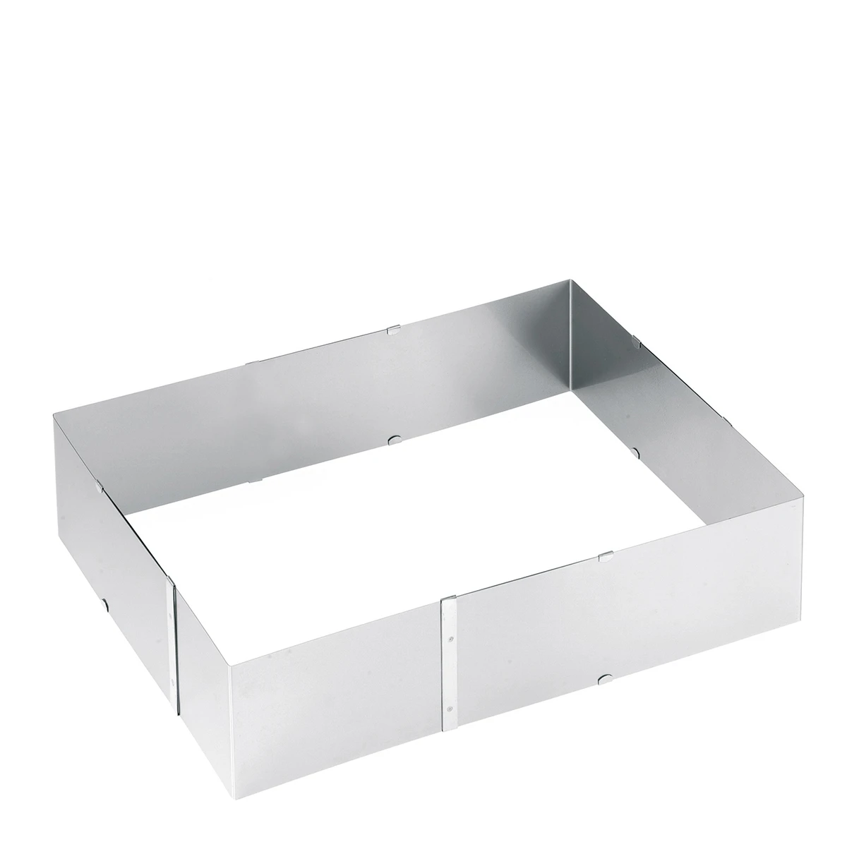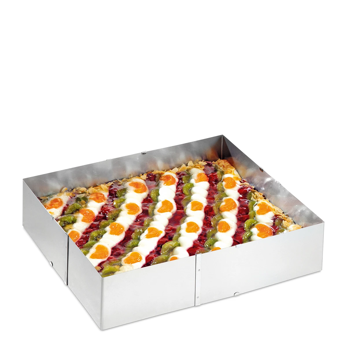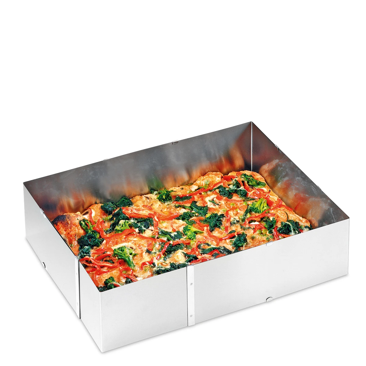 Besonders hoher Backrahmen (8,5 cm) für Kuchen und Pizza mit großzügigem Belag. Stufenlos ausziehbar von 20 x 24 bis 38 x 46 cm.