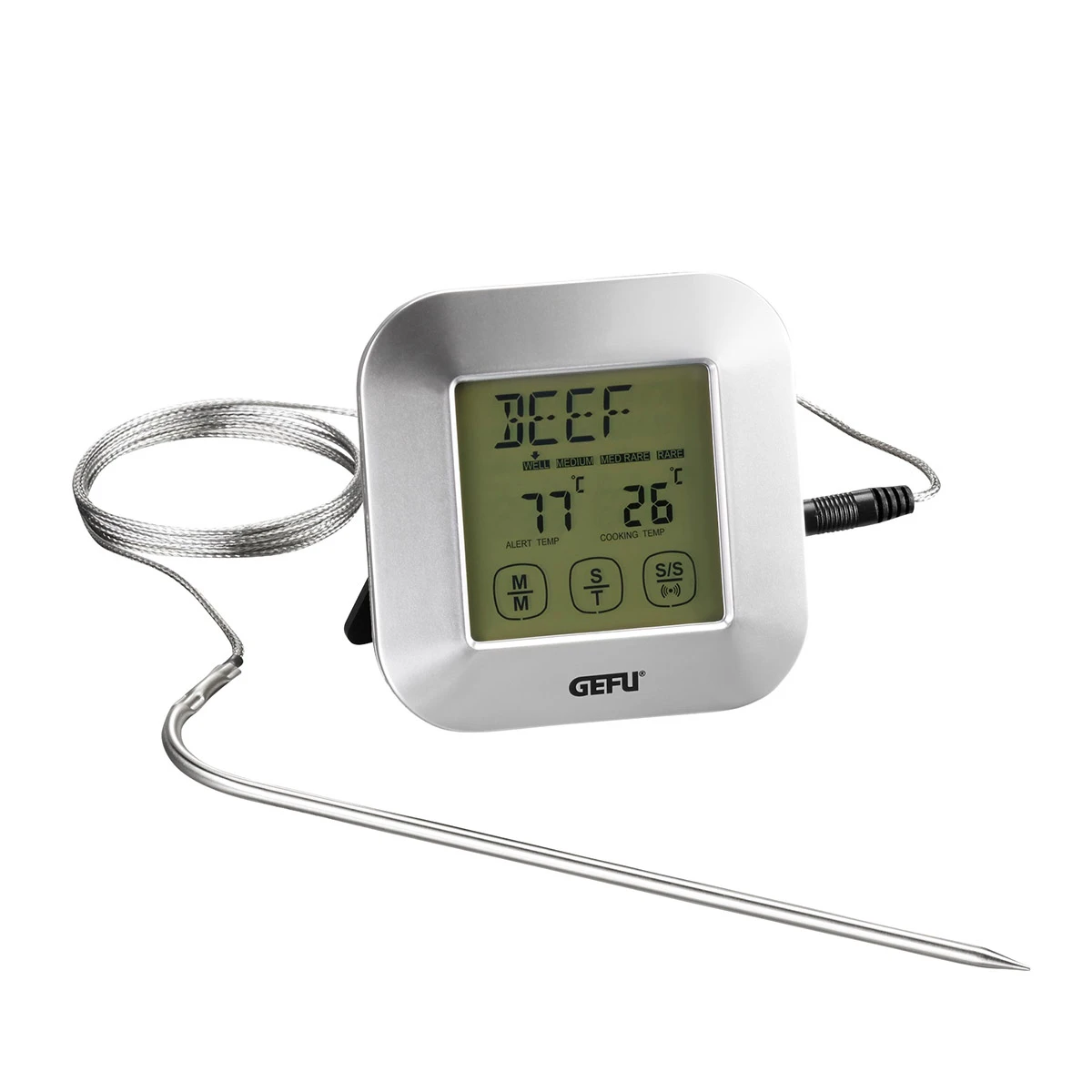 • für Grill, Backofen und Herd • programmierbar mit voreingestellten Temperaturen für Rind, Schwein, Fisch, Kalb, Hühnchen, Pute, Lamm, Hamburger • Messbereich von 0 °C bis 250 °C / 32 °F bis 482 °F • Timer bis 99 Minuten und 59 Sekunden
