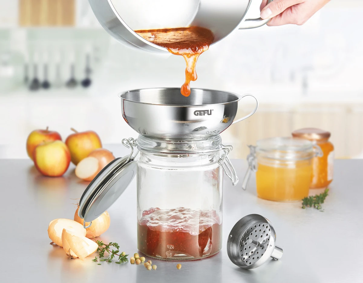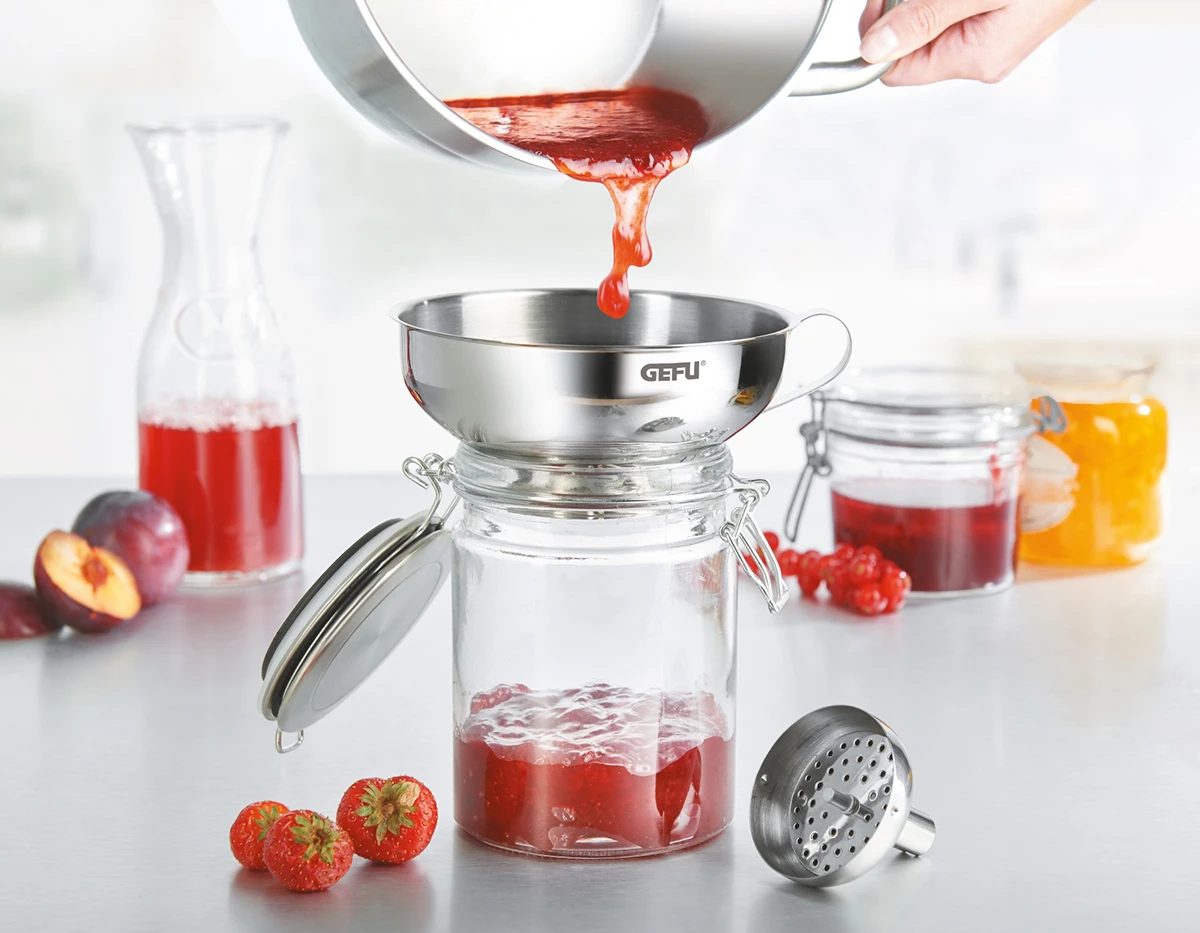 Selbst gekochte Marmelade wird mit dem praktischen Einmachtrichter ebenso mühelos wie sauber in Gläser gefüllt.