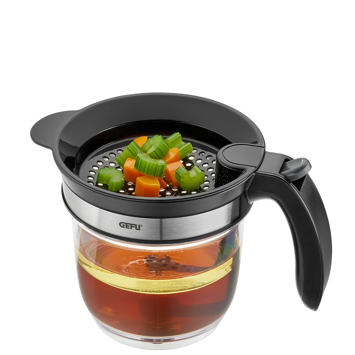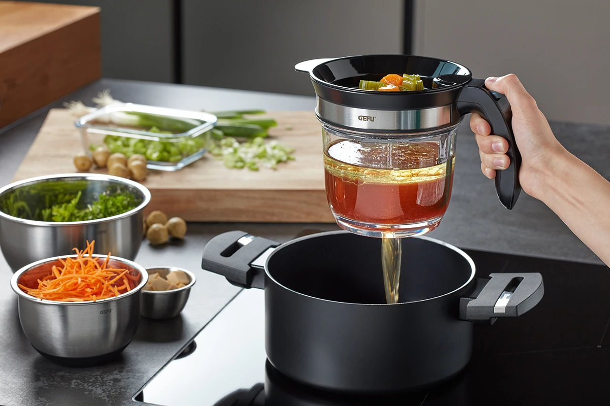 Mit FLUIDO bekommen heiße Suppen, Saucen oder Bratenfonds endlich ihr Fett weg. Einfach in die Trennkanne einfüllen: das Fett setzt sich oben ab und die entfettete Flüssigkeit unten, von wo man sie dann ganz bequem per Knopfdruck durch die Auslassöffnung im Kannenboden entnehmen kann.
