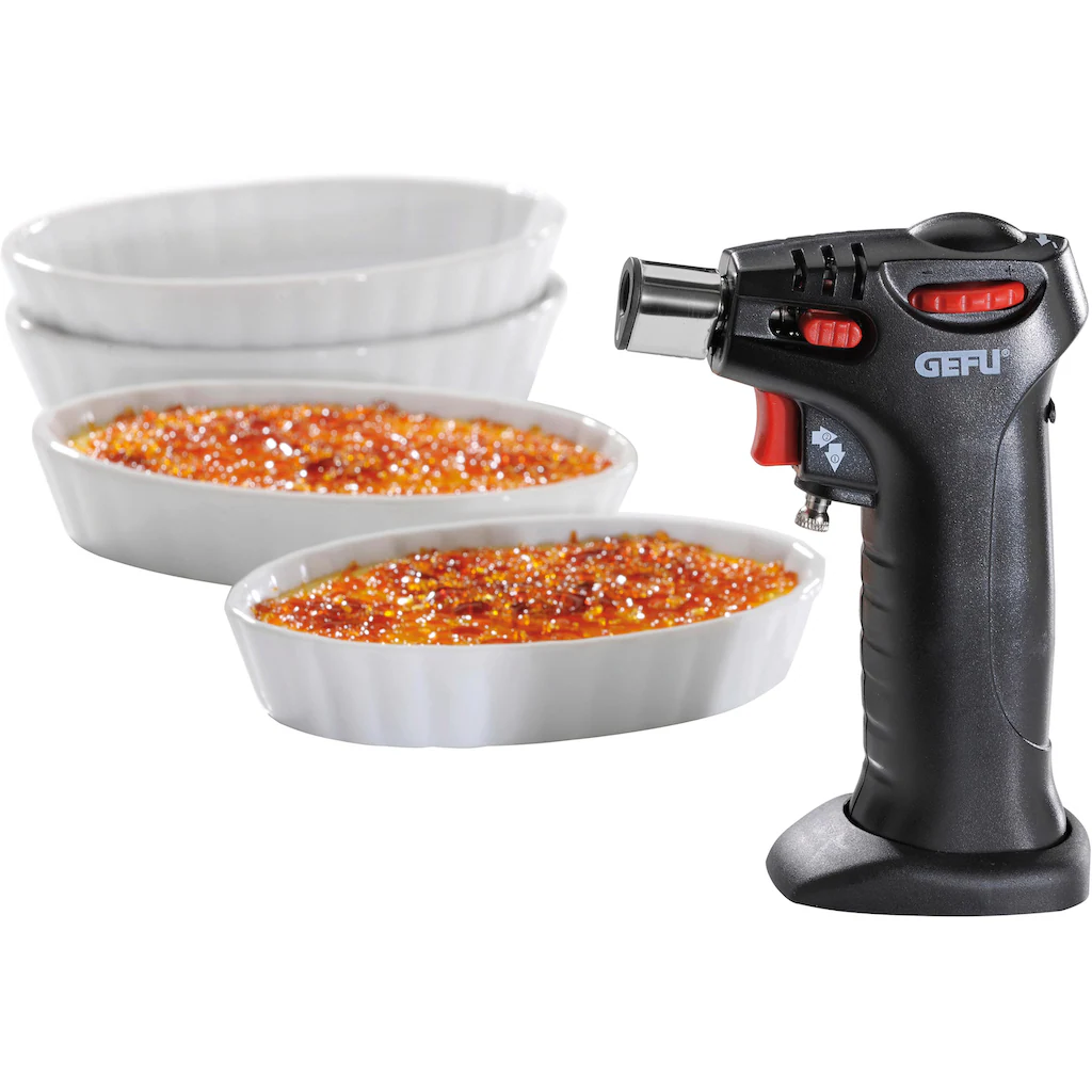 Zum Karamellisieren, Bräunen, Gratinieren und Überkrusten. Machen Sie es wie die Profis: Überziehen Sie Ihre Crèmes oder Torten mit einer knusprigen Karamellschicht. Mit der heißen, in der Größe regulierbaren Flamme kann der aufgestreute Zucker schnell und exakt karamellisiert werden, während die darunter liegende Crème kühl bleibt. Zur Sicherheit ist der Brenner mit einer Kindersicherung ausgestattet (silberne Stift muss gezogen werden um die Flamme zu entzünden). Der Brenner wird ungefüllt geliefert. Zum Befüllen wird handelsübliches Butangas, wie es auch bei Feuerzeugen gebraucht wird, verwendet. Das 5-teilige Set besteht aus einem einstellbarem Gasbrenner, 4 ovale Schälchen aus Porzellan.