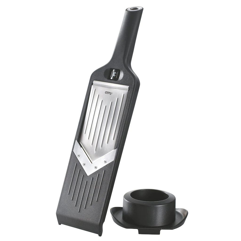 GEFU Gemüse-Hobel, »VIOLI«. Handlich durch die kompakte Größe, ist der V-Hobel »VIOLI« mit den einfach einstellbaren 5 Schnittstärken, der perfekte Küchenpartner für jeden Tag. Schick, schwarz, scharf: Der kompakte Gemüse-Hobel »VIOLI« sorgt im Nu für gleichmäßige Gemüse- oder Obstscheiben. 5 Schnittstärken von 1 bis 5 mm sind einstellbar – und wir der Hobel nicht benutzt, besteht durch die Sicherheitseinstellung keine Verletzungsgefahr. Rutschfeste Füße geben dem Hobel aus ABS-Kunststoff festen Halt. Und die durchdachten Einkerbungen am spülmaschinengeeigneten Hobel fixieren den Küchenhelfer auf Schüssel- oder Topfrändern.