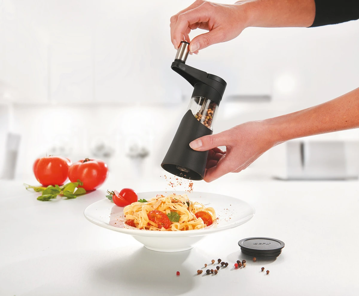 Die Gewürzmühle mit dem stufenlos einstellbaren, hochwertigen Keramikmahlwerk lässt sich bequem durch den leicht abnehmbaren Deckel befüllen und ist mit der ergonomischen Handkurbel einfach zu bedienen. Das Sichtfenster informiert über den Füllstand – und der dicht schließende Aromadeckel sorgt als Verschlusskappe zudem dafür, dass Tisch und Arbeitsplatte sauber bleiben.