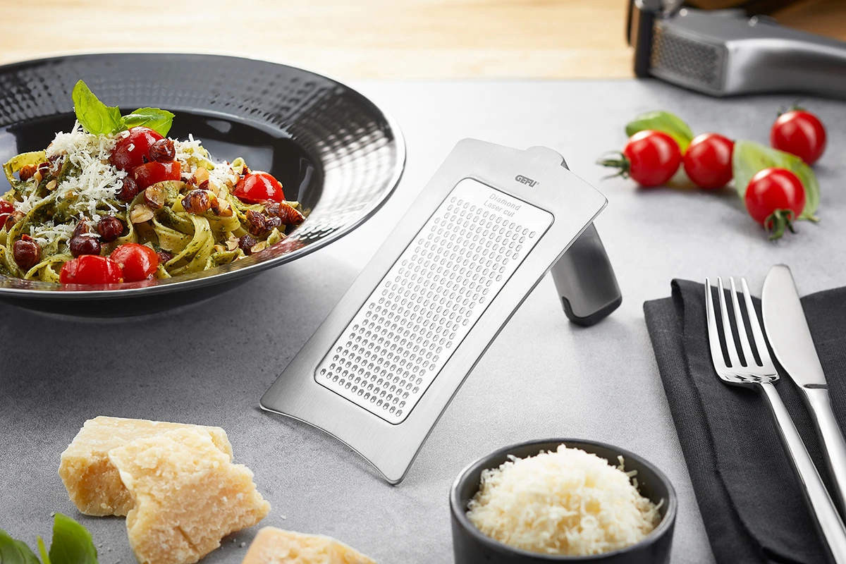 Hauchzarte Käseflocken – frisch auf die Pasta gerieben: köstlich! Die feine Reibfläche mit DIAMOND LASER CUT – Schärfe erinnert mit ihrem Design an Diamanten – und so brillant sind auch die Ergebnisse.