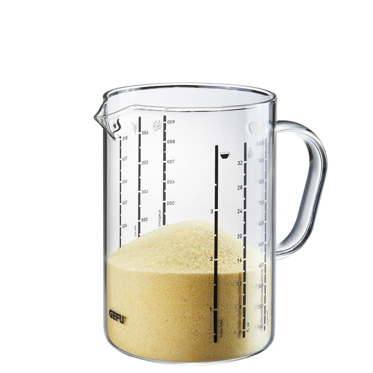 Der unentbehrliche Begleiter beim Kochen und Backen. Klare Markierungen auf dem hitzebeständigen Glaskorpus ermöglichen schnelles, exaktes Abmessen von Flüssigkeiten und trockenen Zutaten.