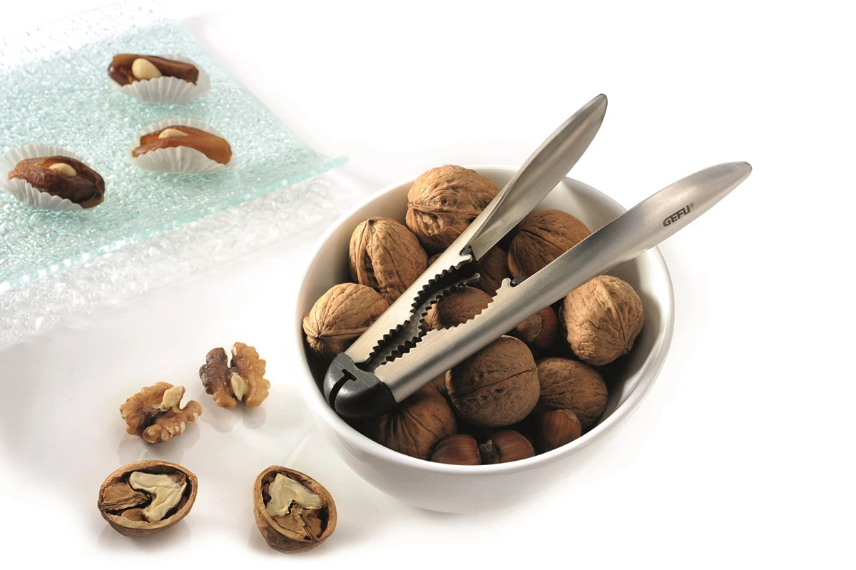 Der robuste Nussknacker aus Edelstahl eignet sich dank der beiden verschieden großen Aussparungen für verschiedenste Nusssorten.