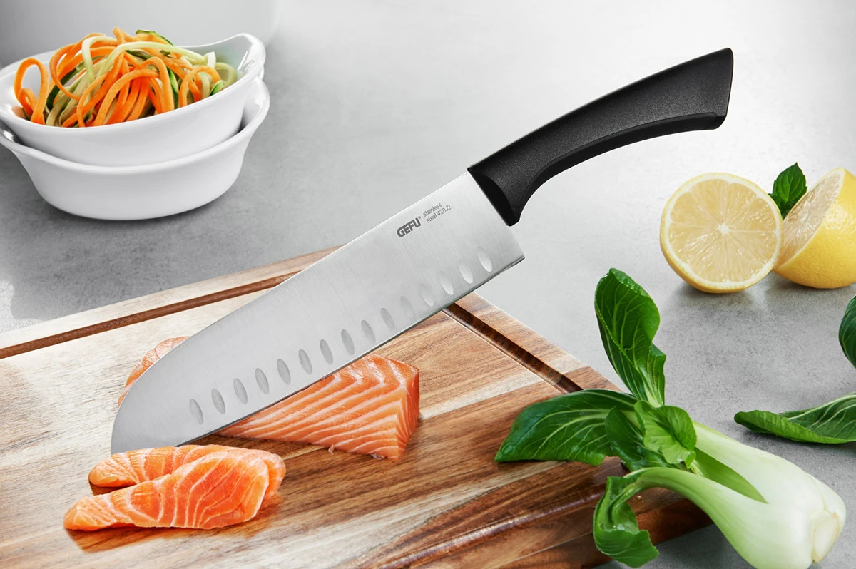 Das Multitalent unter den Messern ist das Santokumesser. Ob Fleisch, Gemüse, Käse oder Fisch: Nicht nur in Asien ist es ständig im Einsatz. Das Santokumesser SENSO ist mit einem Kullenschliff ausgestattet, der dafür sorgt, dass zwischen Klinge und Schneidgut ein Luftpolster gebildet wird – so bleibt das Schneidgut nicht an der Klinge aus hochwertigem japanischem Klingenstahl haften. Der schwarze Kunststoffgriff liegt durch seine ergonomische Form sehr gut in der Hand – und ist auf der Unterseite gummiert, so dass auch mit feuchten Händen sicherer Halt garantiert ist.