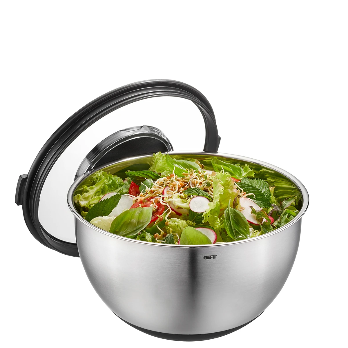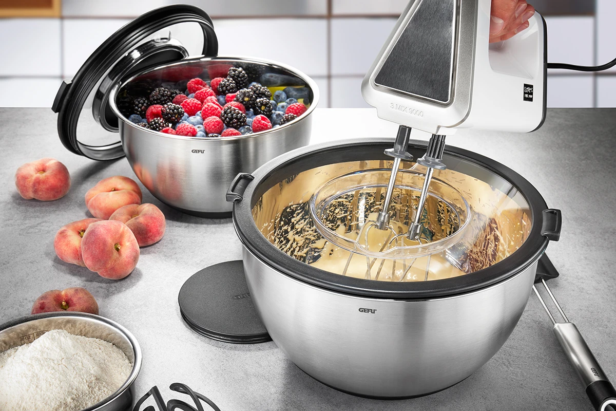 Saubere Sache: Diese eleganten Schüsseln aus hochwertigem Edelstahl sind nicht nur besonders vielseitig und rutschfest, sondern verfügen über einen innovativen Spritzschutzdeckel, der lästige Sahne- oder Teigspritzer beim Rühren verhindert und das Rührgut danach wunderbar frisch hält.