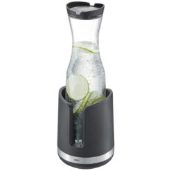 Das Auge trinkt mit: die Designerkaraffe SMARTLINE wird aus hitze- und kältebeständigem Borosilikatglas gefertigt und jedes einzelne Exemplar ist ein mundgeblasenes Unikat. SMARTLINE ist mit einem aromasicheren Deckel ausgestattet, passt in jede Kühlschranktür und schmückt jeden Tisch. • Der stilvolle Karaffen- und Flaschenkühler SMARTLINE im mattschwarzen Designerlook ist mit einem entnehmbaren Kühlakku ausgestattet.