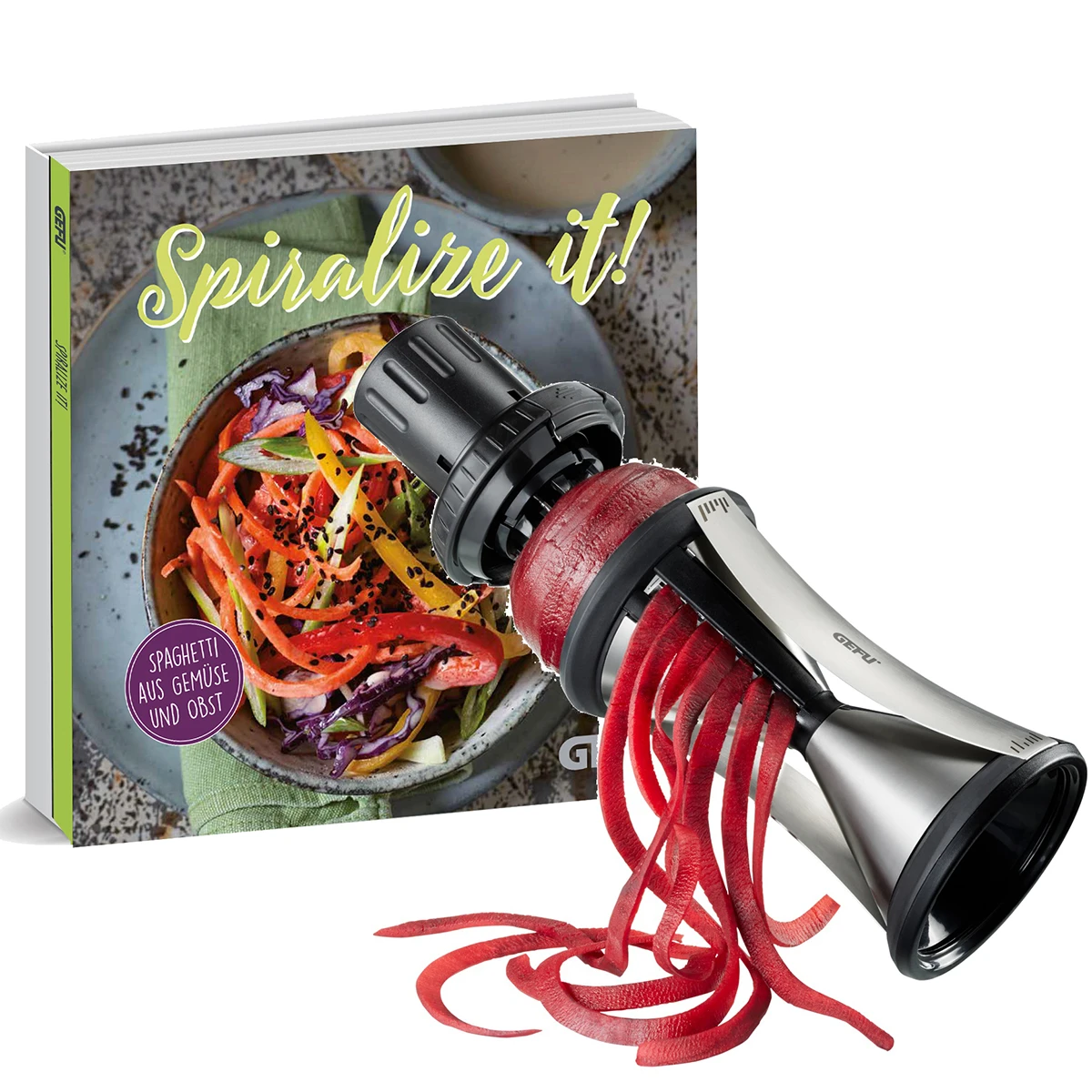 •inklusive hochwertigen, 64-seitigen Kochbuch „SPIRALIZE IT“ mit 21 fantastischen Rezepten zum Nachkochen•mit Reinigungsbürste