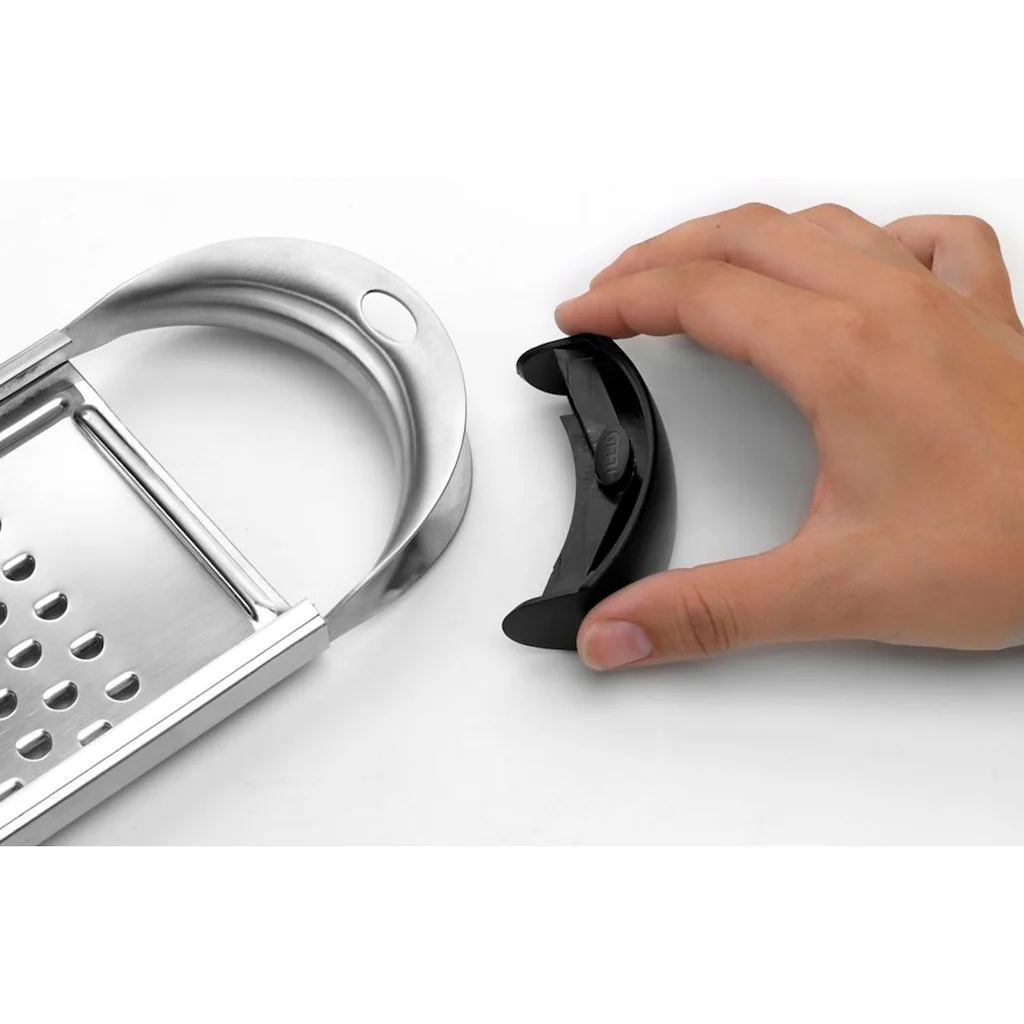 GEFU Spätzlehobel, »TRADIZIONE«. Der handliche Partner für hausgemachte kurze Spätzle, auch Knöpfle genannt. Kurze Spätzle mit angedünsteten Zwiebeln, Petersilie und Käse – ein Klassiker! Und selbstgemacht natürlich besonders lecker! Für die Herstellung der Knöpfle gibt’s den Spätzlehobel aus Edelstahl mit dem ebenfalls aus Edelstahl gefertigten, polierten Teigschieber. Ausgestattet mit einer Topfauflage, damit nichts verrutscht, präsentiert sich der Hobel mit einem neu gestalteten, ergonomischen Griff, der angenehm in der Hand liegt und durch einen Kunststoffeinsatz auch rutschsicher ist. Zur perfekten Reinigung in der Spülmaschine lässt sich dieser Einsatz übrigens herausnehmen!
