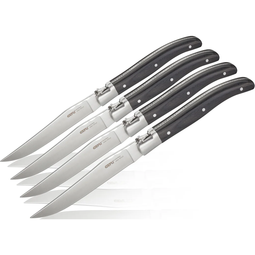 zerteilen die Messer mühelos T-Bone-Steak & Co. Der elegante Griff aus schwarzem Pakkaholz mit