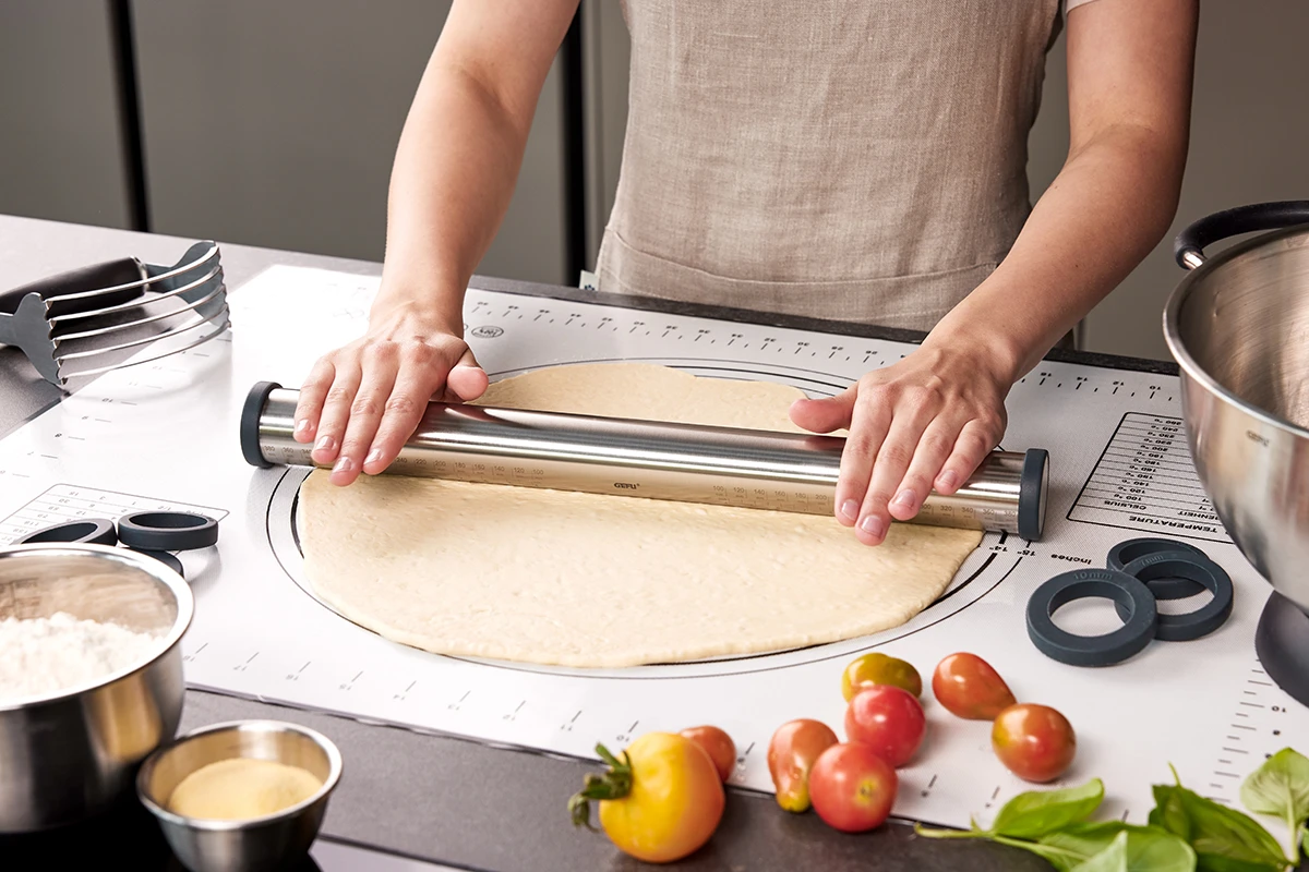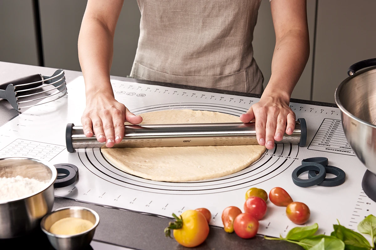 Mit dem innovativen Teigroller REGO gelingt perfekt glatter, gleichmäßiger Teig besser als mit jedem Nudelholz. Einfach das richtige Silikonringpaar für die gewünschte Teigstärke auf den soliden Edelstahlstab aufstecken und losrollen! Perfekt für Kuchen, Plätzchen, Pizza, Nudelteig & Co.