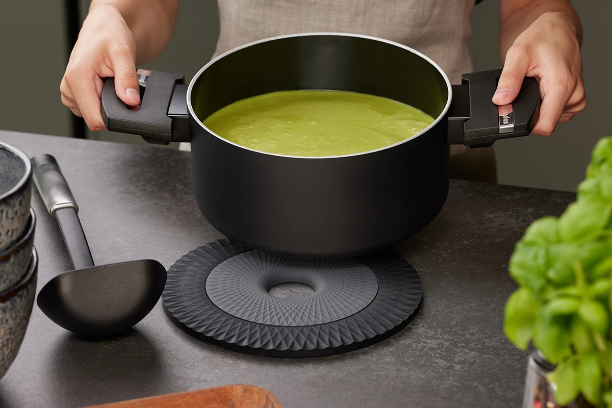 CIRCO ist der clevere 2-in1-Silikonuntersetzer für heiße Töpfe und Pfannen von klein bis groß. Isolierstark und besonders rutschsicher durch seine spezielle Wabenstruktur.