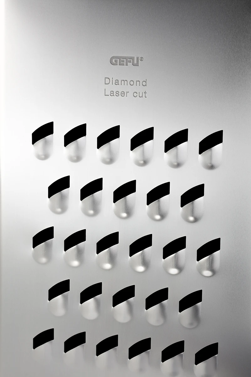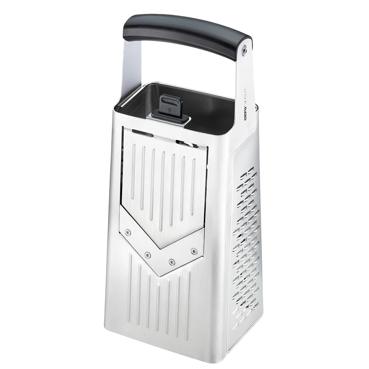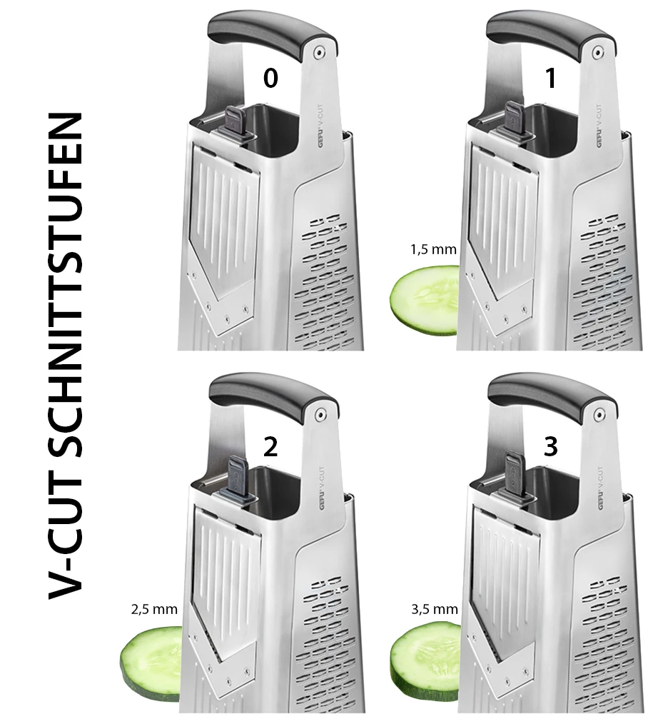 • vielseitige Vierkantreibe mit extrem scharfer V-Klinge • 7-in-1-Multitalent:• grobe Reibfläche für Rohkost• 2-Wege-Reibefläche für zarte Flocken von Hartkäse, Gemüse und Schokolade • Doppelreibfläche, fein für Parmesan und Schokolade und sehr fein für Abrieb von Zitronenschale oder Muskatnuss • extrem scharfer V-Hobel, 3-stufig verstellbar für 1,5 mm, 2,5 mm und 3,5 mm Schnittstärke• auswechselbare V-Klinge aus hochwertigem Klingenstahl• praktischer Auffangdeckel mit Antirutschfunktion• stabiler und ergonomischer Griff