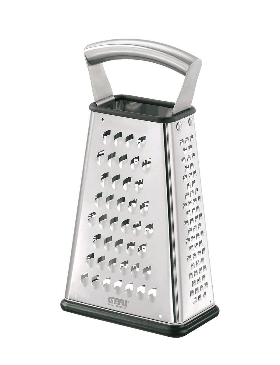 Die Vierkantreibe VITALES bietet Reibflächen für alle Küchenfälle: die feine Reibe für Schokolade, Muskatnuss oder Zitronenschale, eine Gemüse-/Weichkäsereibe, eine Rohkost-/Hartkäsereibe und den Hobel für appetitliche Scheiben. Der stabile und ergonomisch geformte Edelstahlgriff liegt perfekt in der Hand – und der rutschfeste Sockel ist als praktisches Extra zugleich eine Auffangschale für das Reibgut!