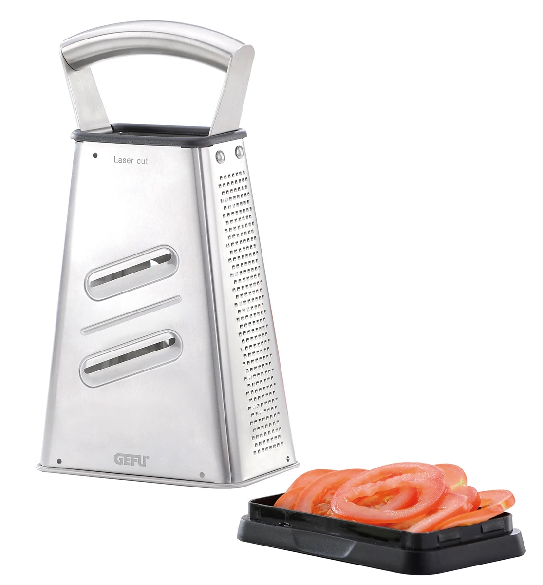 Scharf geschnitten! Dank der LASER CUT-Technologie sind die Reibezähne sehr scharf und garantieren lange Zeit perfekte Reibergebnisse. Mit vier verschiedenen Reibemustern ist man jedem Gemüse, Käse sowie Schokolade, Ingwer oder Muskat gewachsen.